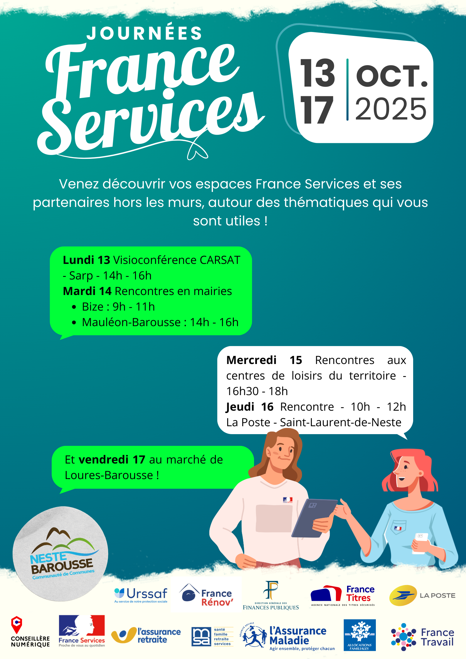Les espaces FRANCE SERVICES de la Communauté de Communes Neste Barousse vous donnent rendez-vous DU 13 AU 17 OCTOBRE 2025 pour les journées France Services spéciales hors les murs.