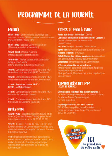 Porté par l’ARS Occitanie et organisée par le CETIR en partenariat avec la commune de Lannemezan , les professionnels et les acteurs de la santé du territoire, cette journée est ouverte à tous et vous invite à découvrir la prévention gratuitement autour de stands et animations : escape game autour de la vaccination, atelier sport-santé-nutrition, randonnée de l’eau et animations enfants autour d’une initiation à la pêche au parc du Guérissa.